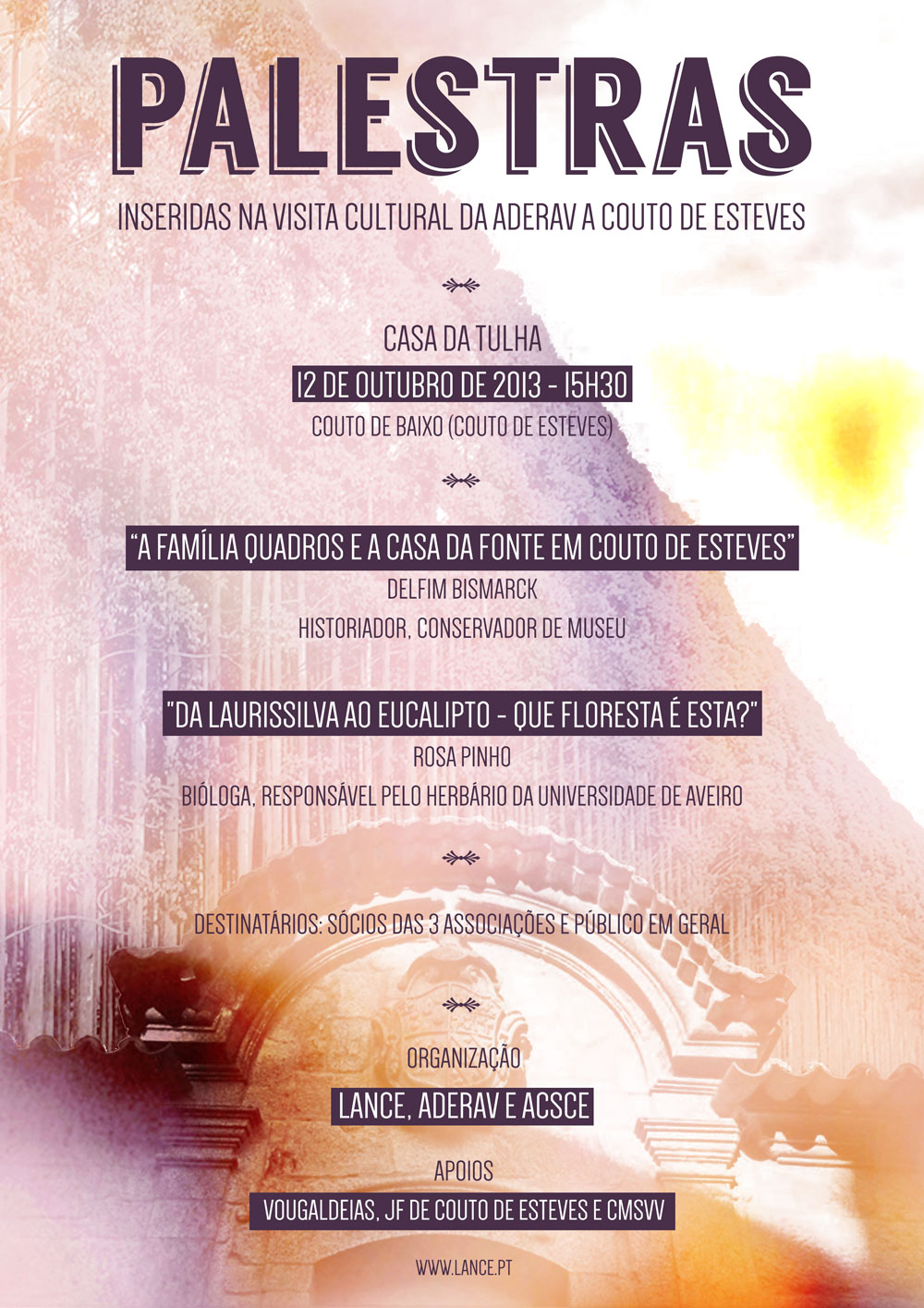 No dia 12 de Outubro de 2013, às 15h30m, iremos realizar, em colaboração com ADERAV e ACSCE, 2 pequenas palestras (ver cartaz) inseridas na Visita Cultural da ADERAV à freguesia de Couto de Esteves.