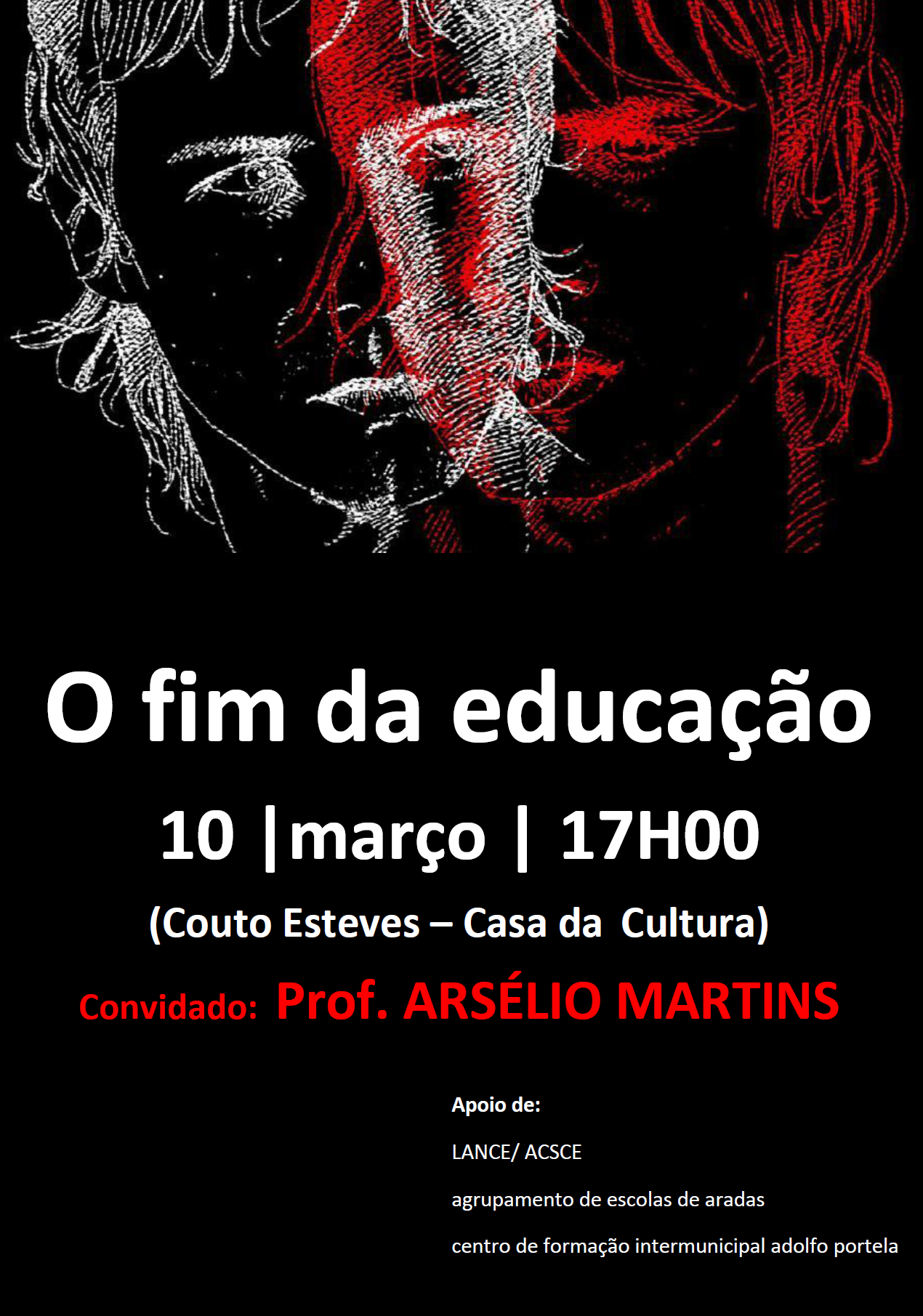 No âmbito das chamadas Tertúlias da Vila, a Associação Cultural e Social de Couto de Esteves (ACSCE) e a Liga dos Amigos e dos Naturais de Couto de Esteves (LANCE) têm o prazer de vos convidar para a tertúlia/palestra "O Fim da educação", com o professor Arsélio Martins, na Casa da Cultura de Couto de Esteves, no dia 10 de Março de 2012, pelas 17h00, não sendo necessária inscrição prévia. Este evento cultural destina-se ao público em geral, revelando-se, no entanto, de toda a importância para os docentes que nela estejam presentes (será certificada pelo Centro de Formação). Neste dia a LANCE associa-se à Associação Desportiva e Cultural de Lourizela (ADCL) na comemoração do seu 19º aniversário e irá organizar em parceria com esta associação e a ACSCE uma caminhada com o percurso Lourizela, Parada, Rio Lordelo, Cascasta da Agualva, Lourizela. A partida será no Largo da Escola de Lourizela pelas 10h e 30m. Para a caminhada não será necessária inscrição. O almoço será livre, aconselhando-se o Restaurante “O Júnior” (234558249), no lugar de Couto de Cima e o Restaurante “O Cantinho da Eira” (966607753/ 918320595), no lugar de Couto de Baixo com marcação prévia.